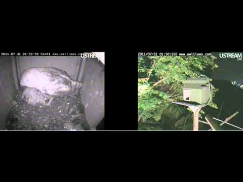 From last night: Roy delivers a treat at 1:49.. He beaks the treat off directly to Belle.. Listen to the Hissssssss from the owlets as Roy enters the room ! Thank you OwlFinn!